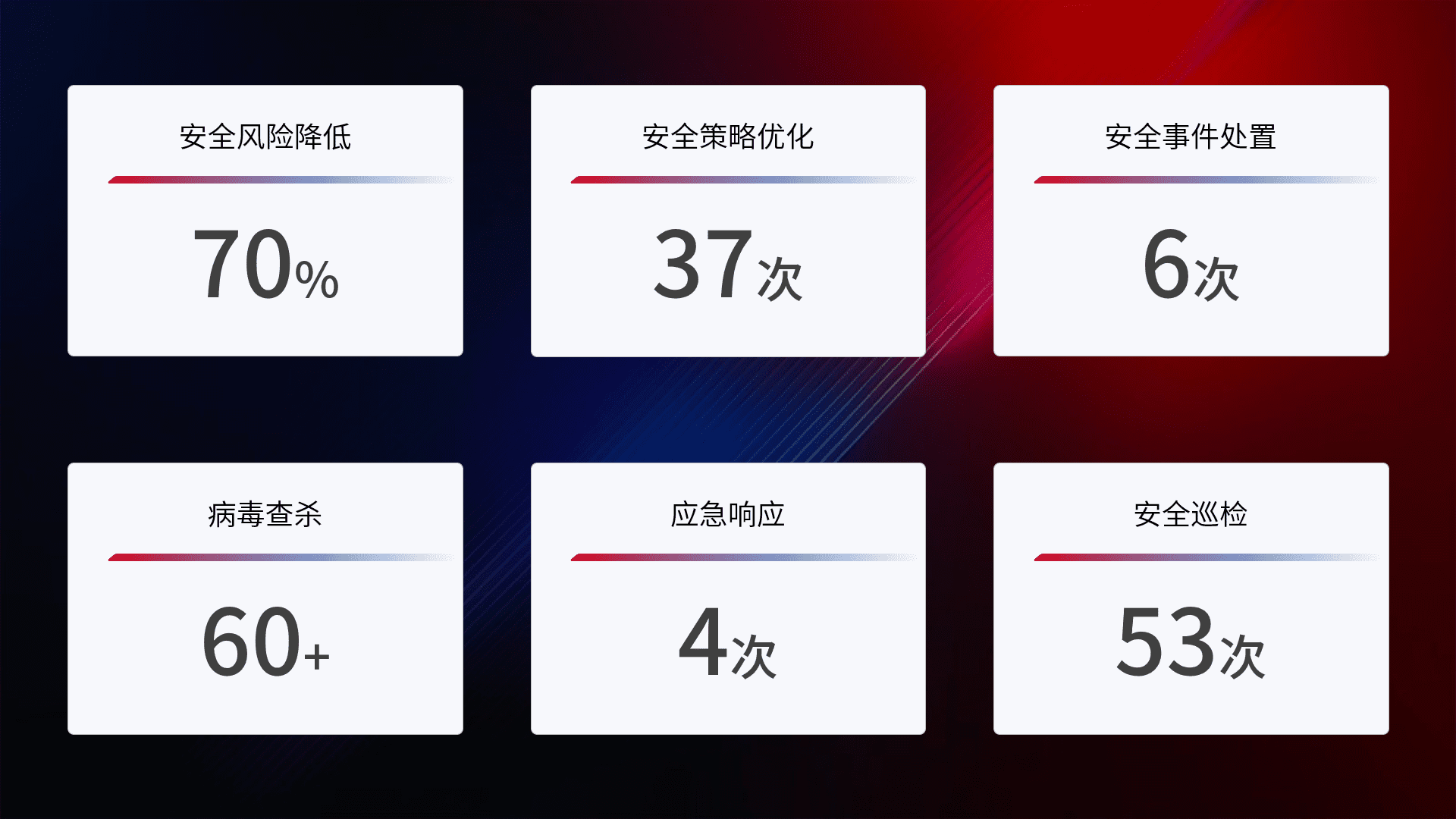 提供全面的安全事件报告体系,,,包括处置报告、、、、周报、、、、季度和年度总结,,,,结合持续监控,,,帮助客户深入了解网络安全状况。。。